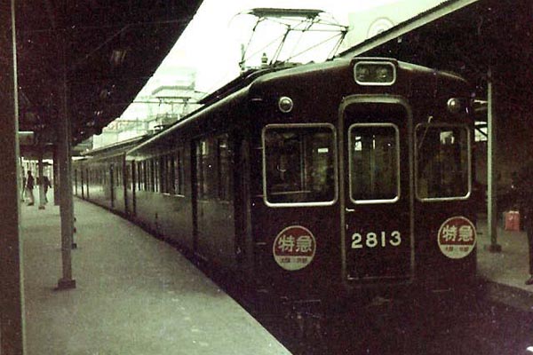イツモながら非常にお見苦しい写真で御免被ります。なにしろ脱色・カビカビおまけに 光カブリのネガなので、スキャンできたのが不思議なくらい。ところで、これを撮った 屋根は見当たらず、思わず違う駅なのか?と悩んだのですが、よーく見ると右上の 屋根の向こうに見えるマトのようなものはどうやらコマ劇場のマーク。そして前方には 国鉄のガードらしきものも見えて、そうなるとやっぱり梅田駅。 この頃、阪急梅田は 現在の位置へ移転工事の真っ最中だったので、仮説ホームの為屋根のない部分が 多かったのか?元々京都線は上屋部分が短かったのか?なにせ43年前の話なので、 阪急京都線 梅田 1967-? Photo by カモ |