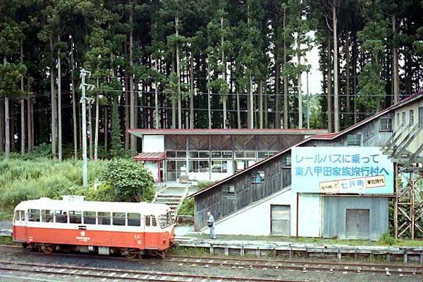 野辺地駅の跨線橋、現在では4・5番線までですが、以前はさらに先に伸びていて、 キハ101・102形のレールバスで有名だった南部縦貫鉄道の野辺地駅がありました。 ところが1968年(S43)東北本線の乙供−野辺地間が短絡ルートに付け替えとなり、 接続駅だった千曳駅も移設され、南部縦貫鉄道とは接続しなくなりました。仕方なく 東北本線の旧線を国鉄から借用し、野辺地まで乗入れるようになったのです。しかし 国鉄がJRとなった後、国鉄清算事業団から有無を言わせない、旧線の買取請求が 引き金となり、1997年(H9)に全線休止となった後、復活する事なく2002年(H14)に オジサン鉄は義理と人情の国鉄時代が懐かしいのです。 南武縦貫鉄道 野辺地 1996-8 Photo by カモ |