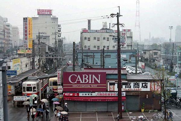 雨の朝、到着した路面電車から足早にJRの駅に向かう人々。やや広めのヤードの ある線路とその向こうに見える工場の大きな煙突。一昔前の黒崎駅前の様子です。 西鉄北九州市内線も折尾−黒崎駅前だけは、まだ残っていました。高度成長期には 夜行列車で出張してきたビジネスマン達が、仕事前に一汗流したであろう「サウナ」の 看板、その裏手は会社の帰りにオトーさん達が一杯ひっかけた立ち飲み屋が並ぶ、 西鉄北九州市内線 黒崎駅前 1998-4 Photo by カモ |