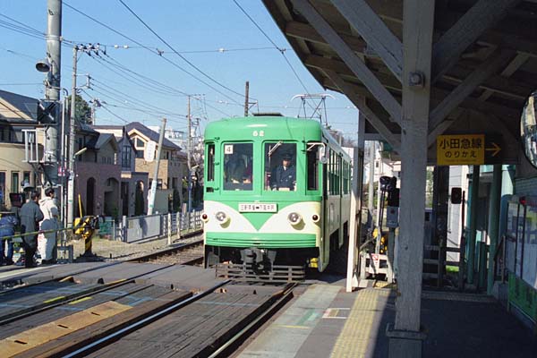 今回の駅撮り探検団は、少し懐かしい世田谷線の山下駅で撮った80形でございます。 っと言うよりゃ、アッシにとっちゃ幾つになっても、玉電の玉電山下で撮った玉電80形 なのでございます。ところで、踏み切りんとこに同業者と思しき人が、写っていますね、 これは、80形が当月中(2001年1月)にお役御免になる為なのでございます。車体色も 往時を偲んで、玉電廃止当時のツートンカラーの旧色に戻して貰った80形廃車間近の 晴れ姿なのでございます。この写真を撮った半月後には、世田谷線に最後まで残った 玉電の生き残りデハ150形も引退、運用車両は300形1形式となり、上屋は鋼材使用で リニューアルされ、ホームも嵩上げされ、アッシの知ってる玉電は消えっちまいました。 東急世田谷線(玉電) 山下 2001-1 Photo by 団長 |