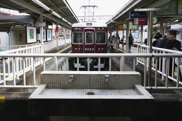 阪急神戸本線夙川から北へ僅か2.2kmの甲陽線の終着駅甲陽園は、小振りなれど 3面2線の頭端式ホームを有した中々趣の有る駅でございました。列車を降りて早速 乗って来た6000系を入れてスナップ致しました。もちろん、もう一歩前に出て撮れば 邪魔な柵は写り込まずに撮れたんですけど、柵の前に有るタイルの洗面台を電車と コラボで撮りたかったのでございました。旧客のボックスシートで朝を迎えた昔々の 庶民の旅にゃ主要駅ホームに在った洗面台は、欠かせない駅施設でございました。 しかし、全長僅か2.2kmの支線の終着駅じゃ、中々見掛ける事の出来ない施設じゃ ないでしょうか。そんな思いを抱きながらシャッターを切り、改札を抜けて駅の外へ、