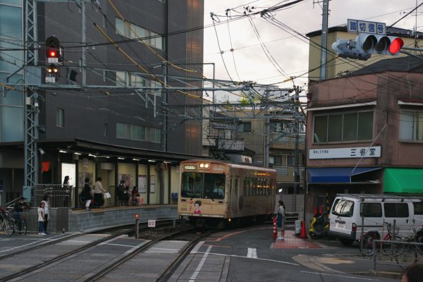 夕闇迫る四条通をを横切るは、京美人夕子ちゃんのラッピングがチャームポイントの 嵐電モボ633を京福西院駅上りホームでスナップした駅撮りでございます。左に見える ホームは、四条通南側に相対式に設置されていたホームを下りだけ四条通の北側に 移設して、今年(2017年)から使用したものなんです。普通ホームの移設なんてぇっと、