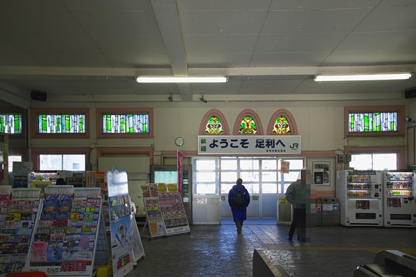 愛でちゃうのです。お約束の時計を配した洒落た造りのハザードにステンドグラスが お似合い、実に雰囲気の宜しい駅舎でございました。 両毛線 足利 2004-8 2009-1 Photo by 団長 |
