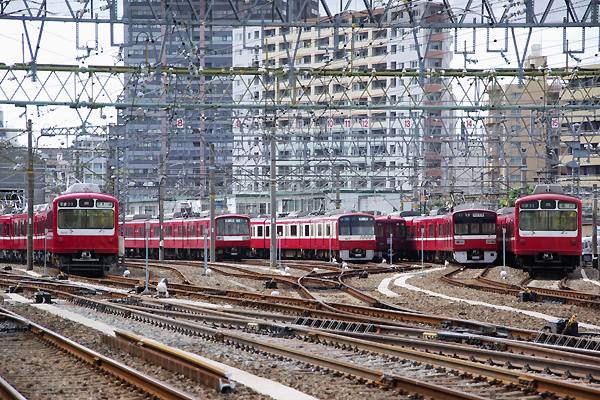今回の駅撮り探検団は、首都圏辺りの鉄分豊富な方やそうじゃ無い方にも評判高い 京急神奈川新町でございます。配線は追い抜き可能な島式2面4線のうえに隣接して 検車区があるんで、始発・終着・車両交換に入換えなどなど、運転扱い現業作業が 次々と目の前で行なわれっちゃう、鉄な人にとっちゃホント堪えられない駅なのです。 そんな神奈川新町の子安方面に駅構内を跨ぐ歩行者線用の橋が、線路に沿ってる 公道上から架かっているのでございます。ってな事で、ホームから撮ってるだけじゃ 飽きちゃうんで、その歩行者専用橋からのスナップをご紹介です。先ずは山側から 下り方面、4番線に1500系川崎行きが停車中、隣にゃ800系が品川の方向幕表示で 出庫転線待機中、その横を通過する構内入換え運転中の新1000系でございます。