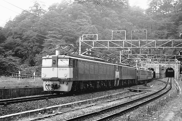 最後部に連結され169系を押し上げる、峠のシェルパことEF63の重連でございます。 ラック時代から単線粘着時代までは、列車交換が行なわれた正真正銘の信号場で ございましたが、アッシが駅撮りした当時は、信号場としての役目は終わってた様で したが、写真を見るてぇっと、下り側トンネル手前に上り線から下り線への片渡りが あったんですね。廃止後暫くは放置プレー状態だった熊野平信号場でしたが、今は 横川から旧アプト線跡を利用した遊歩道が完備され、歩って来れちゃうそうなんです。 ならば、アッシも一回その遊歩道とやらに挑戦、再び熊野平信号場を拝まなけりゃ、 っと思ったけど、メタボの腹抱えて歩ってく自信無し。 信越本線 熊野平信号場 1974-9 Photo by 団長 |