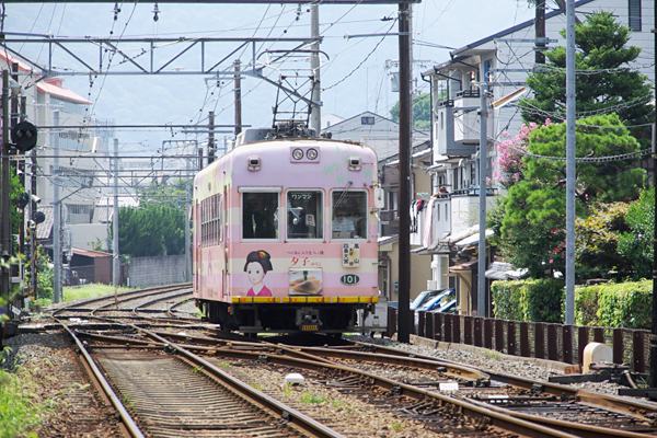 1番線嵐山方面ホーム端からは、上りのモボ100形を素直なアングルでお気軽撮影。 京福嵐山本線 帷子ノ辻