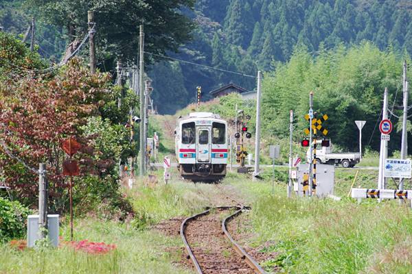 若桜からの帰り道、漢字一文字の駅名に惹かれ隼で途中下車いたしました。去って 行くWT3000形をホームで見送りながら駅撮り、ファインダーから線路を見るてぇっと、 上り方面に向って踏切んとこまで左にカーヴしてんのに気が付いちゃいました。今は 単式ホーム1面1線無人駅の隼も、昔は貨客を扱った一般駅だったてぇ事が、線路の 曲がりで見えてきちゃったのです。撮影を終えて改札抜け表へ出て振り返るてぇっと
