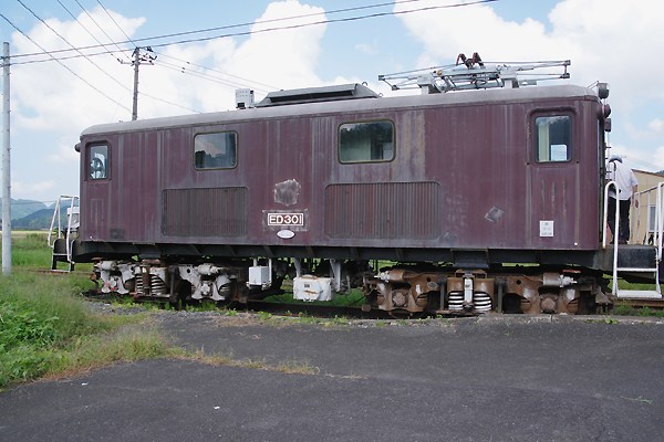 気になっちゃうのが前にくっ付いてる電気機関車でございます。東洋電機S26年製の 妻面に小振りなデッキを付けた箱型の車体は、私鉄の貨物列車牽くにゃピッタシな カマじゃん、なんて思いながら見ていたら・・・ハテ、このカマ以前どこかで見た様な、 そうかぁ、鶴来の車庫ででっかいスノープロー付けていた、北陸鉄道のED301だぞ。 15年前(2003年)に北鉄の鶴来で車籍のある状態で合ったED301に静態と言えども まさかの再会、行き当たりばったりの途中下車もたまにゃ宜しいものでございます。 若桜鉄道 隼 2015-9 Photo by 団長 |