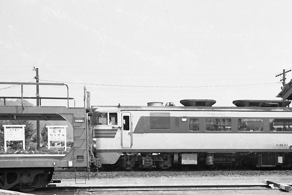 今度は気動車キハ82の上り特急ですね。当時仁万を通過するDC特急は、上り下り とも益田発着の「やくも」と博多発着「まつかぜ」しかございませんでした。そうすっと、 「やくも」は8時20頃の通過なんで、12:41発824レの後に仁万を通過するDC特急は、 「まつかぜ」しかないのです。Exifなんざぁ無い銀塩画像から当時の時刻表を捲って、 写ってる列車をアレコレ推理するてぇなぁ、楽しくも有り、間怠っこしくも有りなのです。 って、端からキッチリとメモってんの一番宜しい様で。 山陰本線 1974-8 Photo by 松原の親方 |