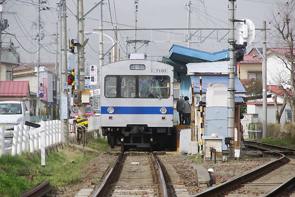 駅と列車のコラボってぇ事で、ラストは福島寄りの踏切からの一コマでございます。 福島交通飯坂線 医王寺前 2007-4 Photo by 団長 |