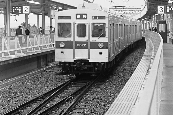 されていました。あれはダブルスリップじゃないと思うんだけど、昔々なんで自信無し。 分岐器を通過すると普通の複線駅風景が展開いたします。素人目に見りゃ、これなら シーサースクロッシング設置可能と思うんだけど、ナンカ不都合あったのかな? 東急 田園都市線 二子玉川(園) 1977-4 Photo by 松原の親方 |