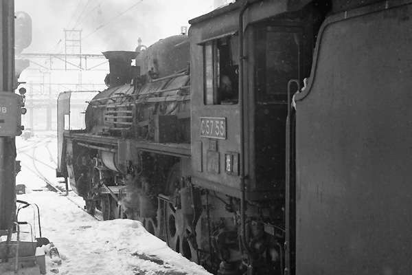 モチロン蒸気機関車だって駅撮り出来ちゃったのでございます。もっとも、カマが半分 ホームからはみ出しちゃってんで、こんなアングルが精一杯なんです。カマは佐倉の C57 55号機、旧型客車を連ねた常磐線経由成田行き普通列車825レでございます。