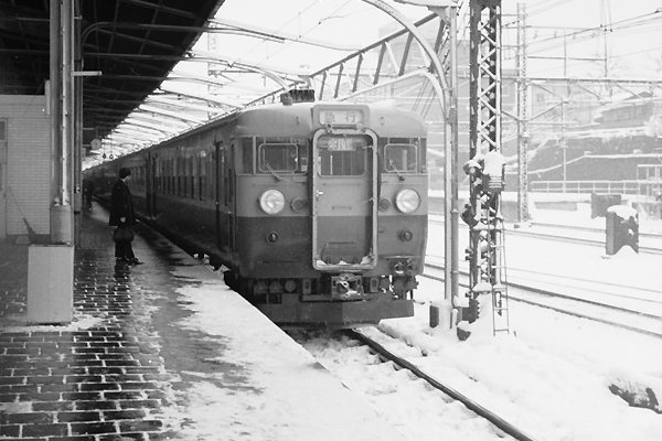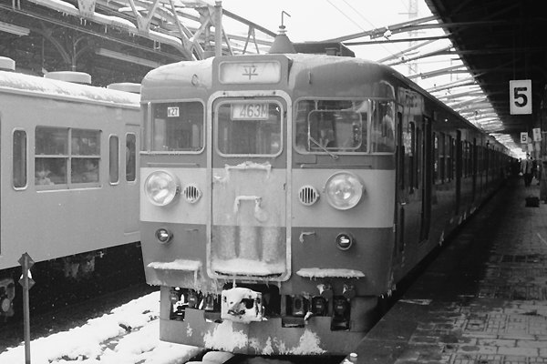 今じゃ発着列車殆んどが銀箱となっちまった上野駅でございますが、新幹線なんざぁ 影も形も無かった、国鉄時代の上野駅じゃ色んな車両の駅撮りを楽しめたのでした。 そんな上野駅に雪が降った日に出掛けた、増結2号車松原物故団員が残してくれた 高架5・6番線での駅撮りを蔵出しでアップです。端に登場は直流区間急行って言やぁ コレ、デカ目の165系でございます。ヘッドマークが無いなぁチョット残念なんだけど、 貫通路上部んとこに表示されてる列車番号は2911M、当時の時刻表からこの列車は 前橋行きの急行「はるな」でございます。昔の優等列車てぇなぁ色んな愛称が付いて いたんですねぇ。それに引き換え、今時のスーパーナンチャラ○号はいけませんや。
