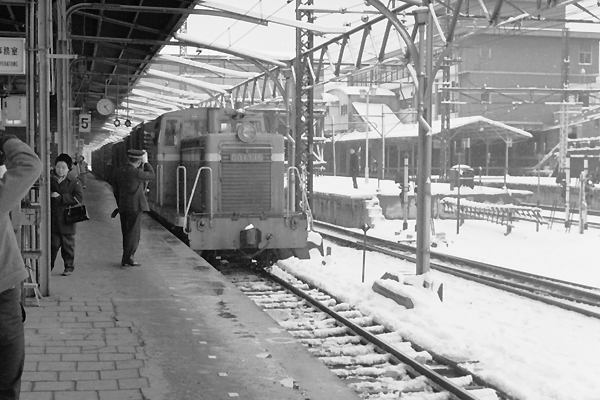 石畳のホームが宜しい5・6番線、真ん中の電気機関車は、交直両用EF80なのです。 今じゃ結構レアになってきたEF81、この時点じゃ未だ生まれちゃいなかったのです。 左の5番線に115系、隣の7番線に停まってる気動車は、水郡線経由福島行き急行 「久慈川」と水戸行き「ときわ3号」、当時は普通に走っていた併結列車でございます。