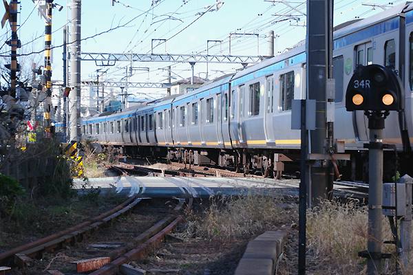 電留線のある相模大塚で途中下車、駅を出て海老名方向最初の踏み切り(約260m) 辺りで待ち構え、12000系の折り返し列車を撮影でございます。光線状態も良くって、 ウムウムなんて喜んでモニター確認したら側線の車止めが、見事に写り込んでたぁ。
