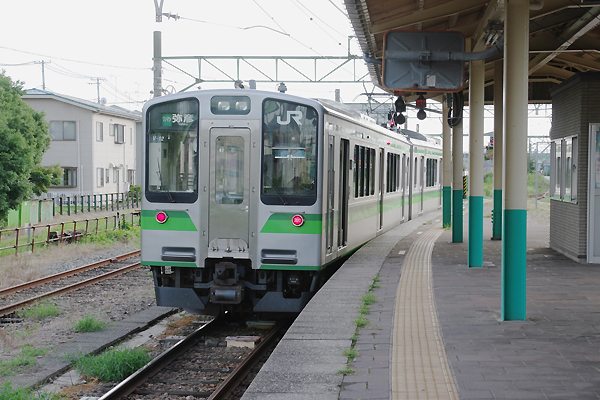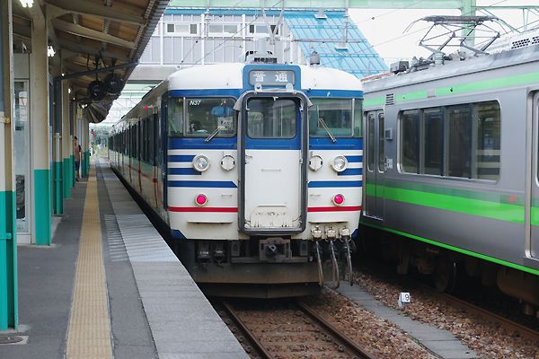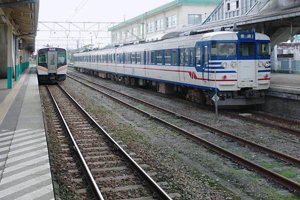 駅撮り探検団ご贔屓のミナサマならもうお分かりと思いますが、前回柏崎から乗った 115系を降りたのは吉田でございます。もっとも、越後線柏崎発の列車は1日9本だけ、 その内6本は吉田止まりなのです。アッシが乗った115系は1番線に到着、先ずは隣の 2・3番線ホームに移動して編成全体を記録。2番線に停まってるステンレスE129系と 比べるてぇっと、古っと思うのは若い証拠、吊り掛け70系で育った乗ったアッシなんざ まだまだ古いなんって感じないけど、もう直ぐ引退なんて信じられないのでございます。