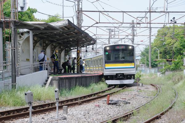 貨物レの次は、205系入線を改札出て直ぐの踏切からスナップ、鶴見線の中間駅で 片面ホームは昭和だけ、鶴見臨港時代に造られたホーム上屋は、同じ片面ホームの