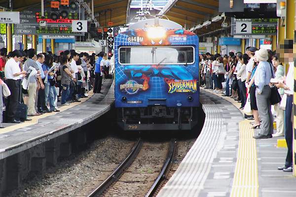 左右のホームにゃ通勤ラッシュより多いんじゃないか、ってな乗客が待つ2番3番線に 入線して来た、リニューアル化とユニバーサル映画お抱えのキャラ、スパイダーマンを ラッピングした桜島線103系です。(JRゆめ咲線)たぁ間違ったって言やぁしませんぜ。 桜島線 西九条 2008-8