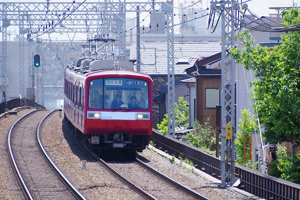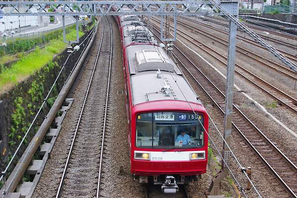 鶴見川を越えて勾配を下りながら鶴見市場に進入通過する、2031〜2038の8両編成 のエアポート急行。 京急本線 鶴見市場 2016-4