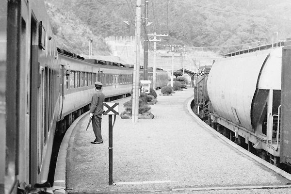今じゃ駅舎に面した片面ホームだけになっちゃった、サミットの矢岳駅でございますが、 当時は2面3線国鉄型の定番配線、DD51牽引の旧客普通列車と交換でございます。 肥薩線 矢岳
