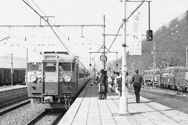 志賀1号到着後、2番線には169系308M妙高2号妙高高原発が、進入して参りました。 ホームには照明塔の柱に取り付けた、下り急行志賀2本の乗車案内板がみえますね。 表記は上から、「特急・湯田中行・ここから前・11:36発・15:56発」っと書いてあるんで、 長電線内は急行志賀を特急種別扱いにしていた様ですね。乗車案内板は3番線側に 付いているんで、下り急行妙高・志賀は、3番線に到着して列車を分割した様ですね。