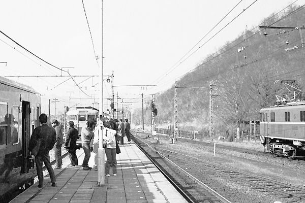 志賀の編成が、下り方向から2番線に転線して妙高の後部に併結しているのが、写真 から判ります。素人考えだと上り列車は、妙高先着にスジ変えれば良いと思うだけど、 ダメなのかなぁ。もっとも、鉄的には転線併結方が、面白いんですけどね。 信越本線 屋代 1975-? Photo by 名誉 団長 |