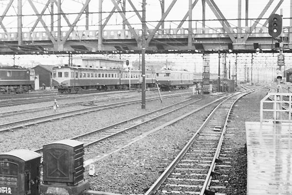 飯田線・名鉄専用の頭端式ホーム先端からは、湘南フェース以前3枚窓だった、80系 初期制御車クハ86の下り普通列車と隣の待機線に停まってるクモユニ74を撮影です。 1968-3
