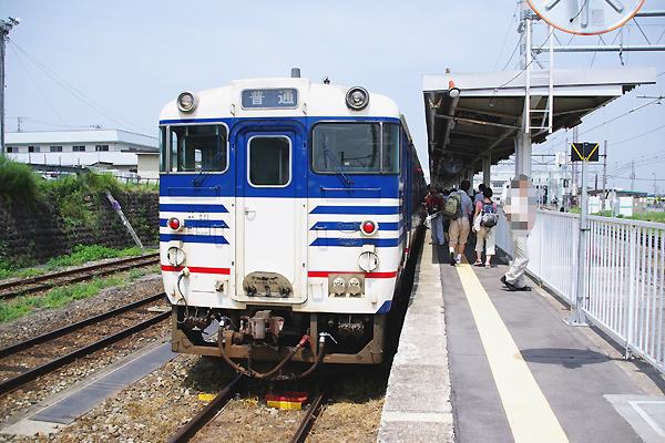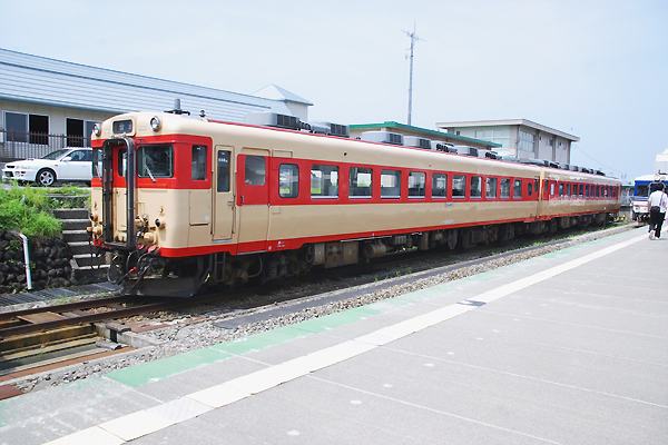 駅本屋に近い4番線に停車中の12:16発坂町行き2両編成は、前がキハ52 120号車