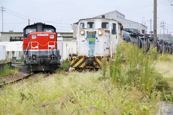 合流地点の末広橋梁側まで後退待機でございます。直ぐ太平洋セメントの入換機が、 空返のタキを牽引して専用線から構外側線へ入線、道路側線路を走行して実入りの