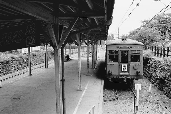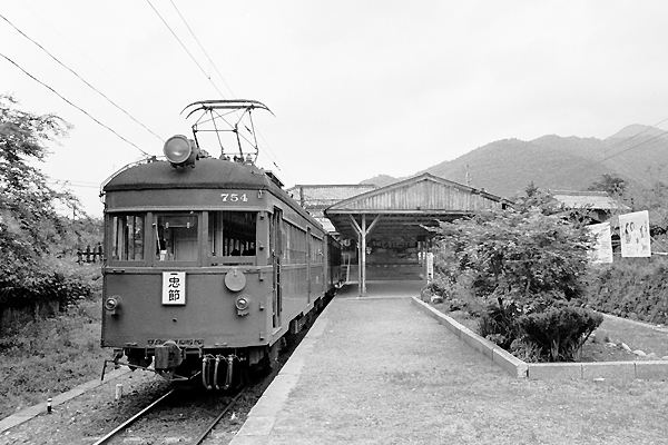 名鉄谷汲線が、廃止になって今年(2021年)で20年経ちましたねぇ。そこで、今回の 駅撮り探検団は、廃止なんざぁ話題にも上って無かった時代、谷汲駅でのスナップを アップでございます。駅舎以外廃止された時と全く変わって無い、谷汲駅のホームに 停まっているのは、廃線時まで稼働した3両のモ750形の中で現在は、旧尾張瀬戸駅 駅舎を館内に再現した、瀬戸蔵ミュージアムにスペースの都合上、1/2にカットされた 状態で静態保存されている、754号車でございます。モノクロなんでよく分かん無いと 思うけど、廃止当時のスカーレットじゃ無くって車体色はダークグリーンでございます。