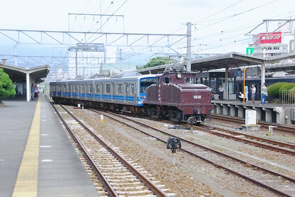 今回も前回に引き続きましての手抜き企画、私鉄電気機関車の駅撮りでございます。 オープニングは、大場工場倹査入場で小田原から甲種で来た、大雄山線の5000系を 受け取りに来た伊豆箱根鉄道駿豆線のDE32、所謂東芝戦時標準設計ってな凸型の 40tクラス小型電気機関車ですね。貨物輸送の方は、50年近く昔に終っちゃったけど、 甲種車両の牽引や大場工場の入換に僚機ED31と一緒に活躍中でございます。 伊豆箱根鉄道 駿豆線 三島 2011-6