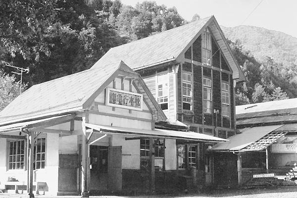 そして、これが、正真正銘の島々駅本屋でございます。エンタランス上部の駅名表は、 戦前の倣いに従った「車電行本松」って右から左の横書きになってますねぇ。流石に 筑摩電気鉄道が、気合を入れて建てただけの事の分る、洋風の瀟洒な駅舎ですね。 復元された駅舎も正に匠の技の出来栄え、なのに解体とはねぇ、夏に東京で無理くり やったナンタラピック、お上が使うお足の使い方が、野暮の一言じゃございませんか。 松本電鉄(アルピコ交通)上高地線 島々 197?-? Photo by 名誉団長 |