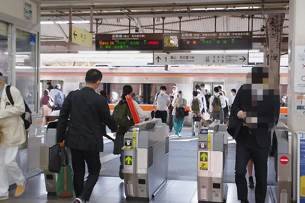 見た目メインの改札口はJR側ようでございますが、実際の乗車人数は、近鉄がJRの 4倍強で勝負にならないのです。でも、発車案内板はJRのみ、流石にJR東海ですね。
