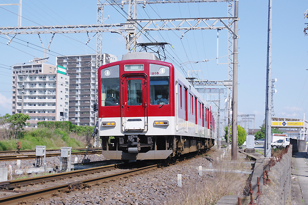 次はJR側から横断地下道通って近鉄側に回る、線路沿いの公道から今風近鉄顔の 元祖1201系の回送車を駅傍スナップ、写り込んだ昭和チックなコンクリ柵も問題無し。