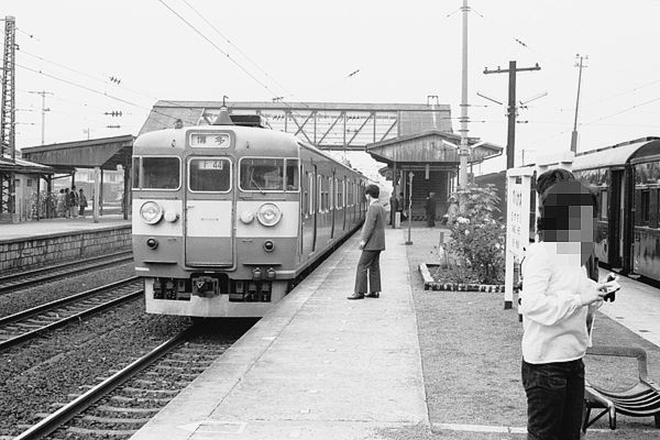 今回の駅撮り探検団は、松原物故団員撮影の銀塩ネガから、蔵出しでスキャンした 鹿児島本線遠賀川でございます。先ずは、421系か415系かアッシにゃ判断出来ない けど、近郊型111系交直両用ヴァージョンの博多行各停と思われる列車の到着です。 そして、遠賀川と言えば、421・415系の反対側の3番線に停まってる室木線ですね。