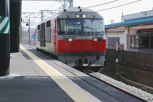 キハ40客扱い終了発車と同時に、今度は1番線をJR貨物のDF200単行が、接近通過 していきました。カマの右側に見えてんのが、橋上化後も残ってる沼ノ端駅旧駅舎。