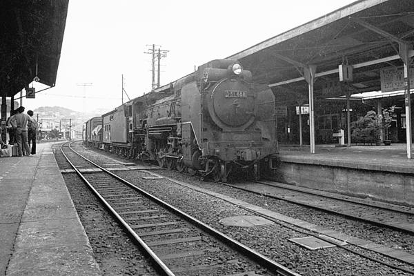 今回は、松原物故団員遺作銀塩の中から、宮脇氏が’偉大なるローカル線’と称した、 山陰本線の無煙化以前に撮影した、浜田駅撮りを蔵出しスキャンでアップです。その 浜田駅1番線に入って来たのは、通過か到着か判んないけど、D51 488号機牽引の 貨物列車でございます。この488号機は、浜田機関区に最後まで残ったカマの1両で、 山陰本線無煙化記念列車本務に付いた、当時は、結構セレブな蒸気機関車でした。