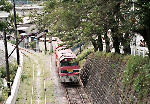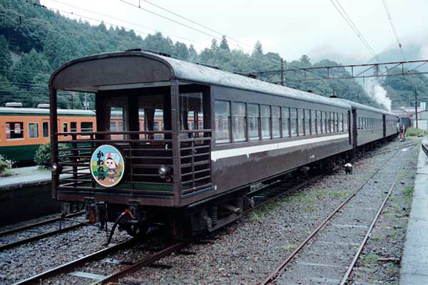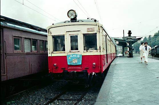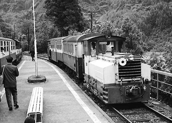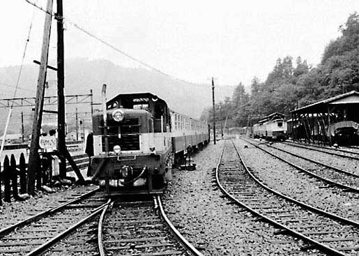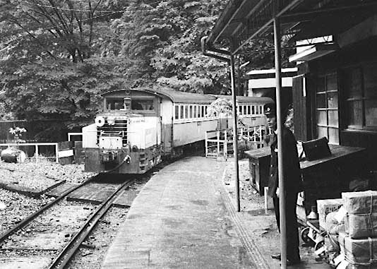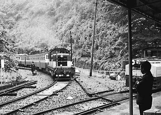 井川駅にて 狭い崖の中腹にある駅、長編成だと後部はトンネルの中でした。 1983年訪問の中からC形コッペルの保存運転とSSE