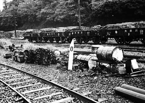井川線0キロポストと貨車 向こうに材木の山が見える。
