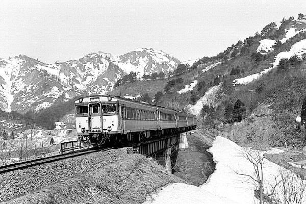 残雪の朝日連峰を背に宇津峠を下る、キハ58系急行あさひ。