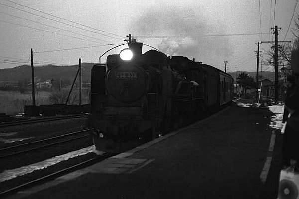 ライトを輝かせ夕暮れの駅に進入する、C58牽引の混合列車。