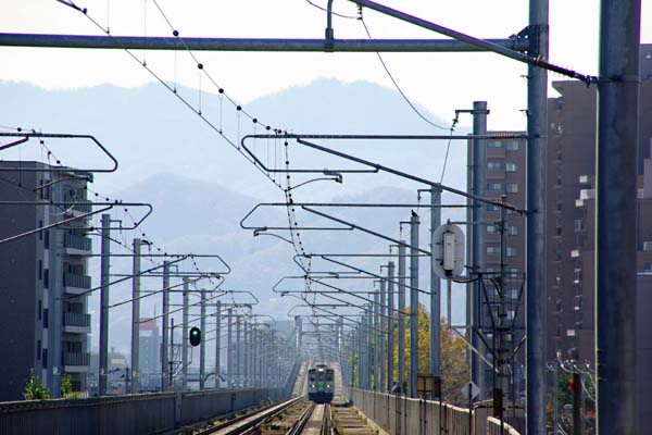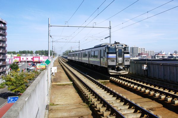 珍しい都市風景の非電化複線高架区間を狙ったけれど、架線柱が建ち架線も装架済で、 札沼線 新琴似