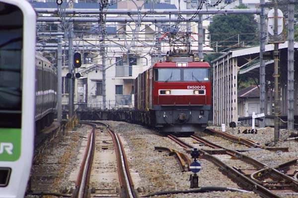 一切無し。そこで、今週はお気軽な駅撮りポイントをご紹介でございます。山手線の 内側に並行している山手貨物線、今じゃ湘南新宿ラインなんて呼ばれて銀箱電車が 頻繁に走っているんですけど、今でも一日数本の貨物列車が設定されているんです。 その内の一本がEH500牽引の3086レ、コノ列車は12時頃に山手貨物線を通過して 行くので、朝寝坊してもユックリ間に合うマコトニ都合の宜しいスジなんでございます。 渋谷からほぼ一直線の線路が原宿駅ホーム階段のあたりから内側にカーヴを描き 宮廷ホームに向かう、その階段あたりから南へ向かう3086レを望遠で狙うと中々の 好カットが期待できる筈なんでけどねぇ、現実は厳しいのです。写真を見れば判る とおり、シャッターを切ったのは宮廷ホームを3086レが通過したあたり、本当はもっと 引きつけたかったんです。引きつけてシャッター切れなかった原因は左端しにチラリ 写っているE231500番台山手線内回り電車、そう、日中の運転間隔4分の山手線を どう交わして撮るか、コレばっかりは運しかございません。 山手線
