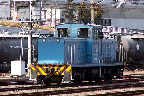 普段は閉じているヤード端のゲートが開いて、何やら係りの人が慌しく動いています。 すると道路を挟んだ向かいの工場からスイッチャーが現れ、JRが運んできたタキを 受け取りに来ました。どうやら日立セメントの専用機のようです。プレートナンバーは DD352 ちょっと不勉強だったのですが、このディーゼル機関車は1974年川重製で 元は加悦鉄道で活躍していて、1985(昭和60)年にこの地に移ってきたとのことです。 次は道路を横断している姿を撮りに来ようと思っていましたが、機会がないまま、この 常磐線