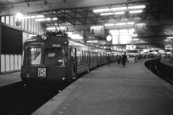 真っ最中でございます。その工事が完成すると、今は山手線を鉄橋で越えて戦前に 造られたチョイと産業遺産の雰囲気が漂う、古い高架橋を渋谷川沿いに走り現在の 渋谷駅に至る線は駅共々三途の川を渡っちまうんです。下り側ターミナル桜木町は 2004年みなとみらい線との相互乗り入れ開始により消滅、これで渋谷駅が道路の 下に移ったら、頭もシッポも無い胴体だけキセルの管みたいな鉄道になっちゃうよ。 ヤッパリ大手私鉄のターミナルって言えば頭端式のホームに引っ切り無しに列車が 発着しているのが、オジサン鉄の頭に浮かぶイメージなんでございます。と言う事で、 今週の駅撮り探検団は青ガエル5000系が生息して頃の東横線渋谷駅をご紹介。 東急東横線