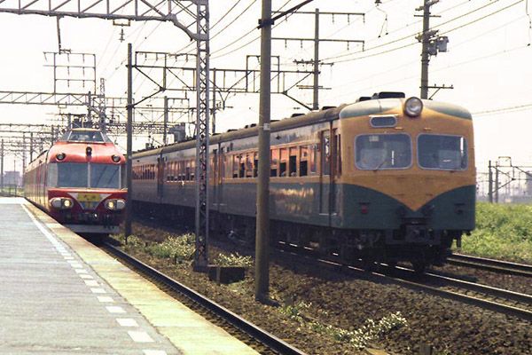どちらも一時代を築いた戦後日本の名車!! こんな並びが駅から撮れたのですから、 いや〜良い時代でした。それにしてもこの時、東海道本線で冷房ギンギン、空気バネ フカフカの名鉄パノラマカーに対抗していたのが冷房無し板バネ、コイルバネの80 系 ですから、今とは違って豊橋〜岐阜の競合区間では当然勝負になりませんでしたね。 ところで、駅撮りと謳っておきながら、実はどこの駅で撮ったのかがはっきりしません。 たぶん中日球場前(のちのナゴヤ球場前、現山王)だと思いますが・・・。ということで、 近隣の方でしたら判るかと思いますので、心当たりのある方はぜひ教えてください。 名鉄名古屋本線