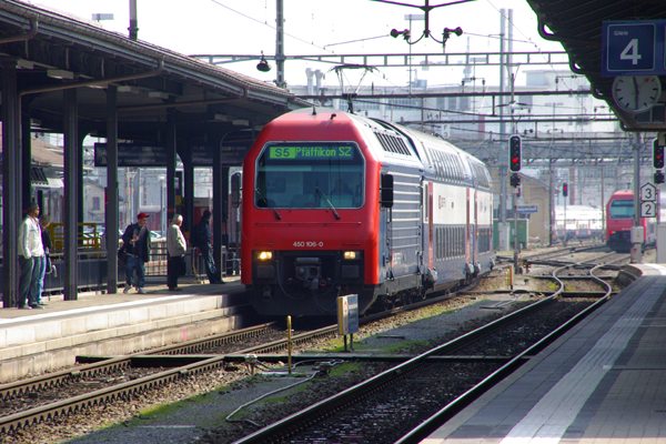 今週はソノ期待に応えて出しちゃいますよ、洋モノ、ソレも撮りたて新鮮なヤツですよ。 真っ赤な面構えで駅に入ってきたのはスイス連邦鉄道、早い話がスイス国鉄SBBの Re450型電気機関車でございます。この電気機関車はチューリッヒ地域を走るSバーン 専用電機機関車で後ろに連結しているダブルデッカー客車3両と合せ4両固定編成を 一単位で運用についているんですよ。最後部の客車は当然運転台付きの制御客車、 日本流に言えばクハ、機関車の方も方運転台なんでございます。ラッシュ時になると 4両固定編成を3本も4本も連結して走る姿はなかなかの迫力です。実はこの写真、 本当なら撮る事が出来なかった筈なんですけど、この時アッシは日本人1万数千人の 火山噴火難民の一人となって、スイスに足止め中にヤケクソで撮った駅撮りなんです。 SBB
