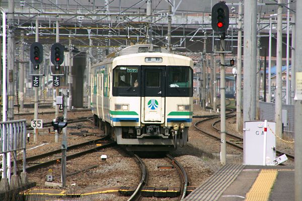 大きな駅で信号機ナンカからもJRの匂いがプンプンするでしょ、でも写真の車両は どう見ても私鉄風ですね。なんつぅ事を言っても見慣れないと思ったのはアッシだけ、 そう、この車両はJR福島駅の端っこにある自社の福島駅に到着する、阿武隈急行 8100形でございます。阿武隈急行の福島駅は福島交通飯坂線との共同使用駅で、 一番右に見える線路は飯坂線用なんです。ところでミナサン8100形の進入経路を ヨ〜ク見て下さいね、JRの線路を横断して来るの分りますか?と言う事で8100形の 仕様は私鉄には珍しい交流電車なんですよ。思鉄面々が若い頃には丸森線なんて 線名の盲腸線で国鉄赤字線トップ10常連だったのがウソの様な光景でございます。 阿武隈急行線