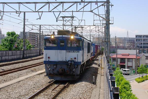 暑い暑い夏の楽しみは18切符で行く鉄な旅、その旅の目的地が首都圏なら、チョット 寄り道して電気機関車の駅撮りなんつぅ〜のも宜しいかと。関東の貨物レファンには チョイとは知られた定番ポイント「八丁畷」が、そのの寄り道推奨の駅でございます。 近頃は定期では昼間旅客列車の先頭に立つ事が無くなってしまった、電気機関車を 撮ろうとすると、被写体は必然的に貨物列車になるんですけど、ダイヤが直ぐには 分らないのが難点ですよね。そんな時は此処「八丁畷」に来れば O K 、駅としては 南武支線の交換設備も無い片面ホームの中間駅だけど、線路の方は浜川崎を経て 東京貨物ターミナルへ続く貨物列車の大動脈でございます。平日ならお昼頃1時間も 此処に居れば、右から、左から、7〜8本の貨物レをモノにする事が出来るんですぜ。 カマの種類も写真のEF64の他にEF65・66・210・EH200とヴァラエティー十分ですよ。 是非ミナサンも電気機関車の持つ重量感を、駅撮りで堪能してくださいマッセェ〜。 南武支線 八丁畷 2010-6 Photo by 団長 |