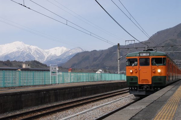 上越線の上牧は、駅舎からホームまで長い階段を上る事で知られていますね。その なかなか好きな駅なのですが、絶景の山々をバックにして駅へ入線して来る列車を 収めるカットは以外と撮りにくいものです。18キップと有休の消化目的で、なんとなく けど、普段は昼間の運行が無いEH200型 Blue Thunder の牽くコキ貨物レやケヨ向 E233系甲種なんかが来るは来るは、って実はその2本だけですけど・・・・。そう言えば むかし、中央線の低屋根70系を山スカなんて言いましたっけ、じゃ上越線の115系は 上越線 上牧 2011-3 Photo by むさちゃん |